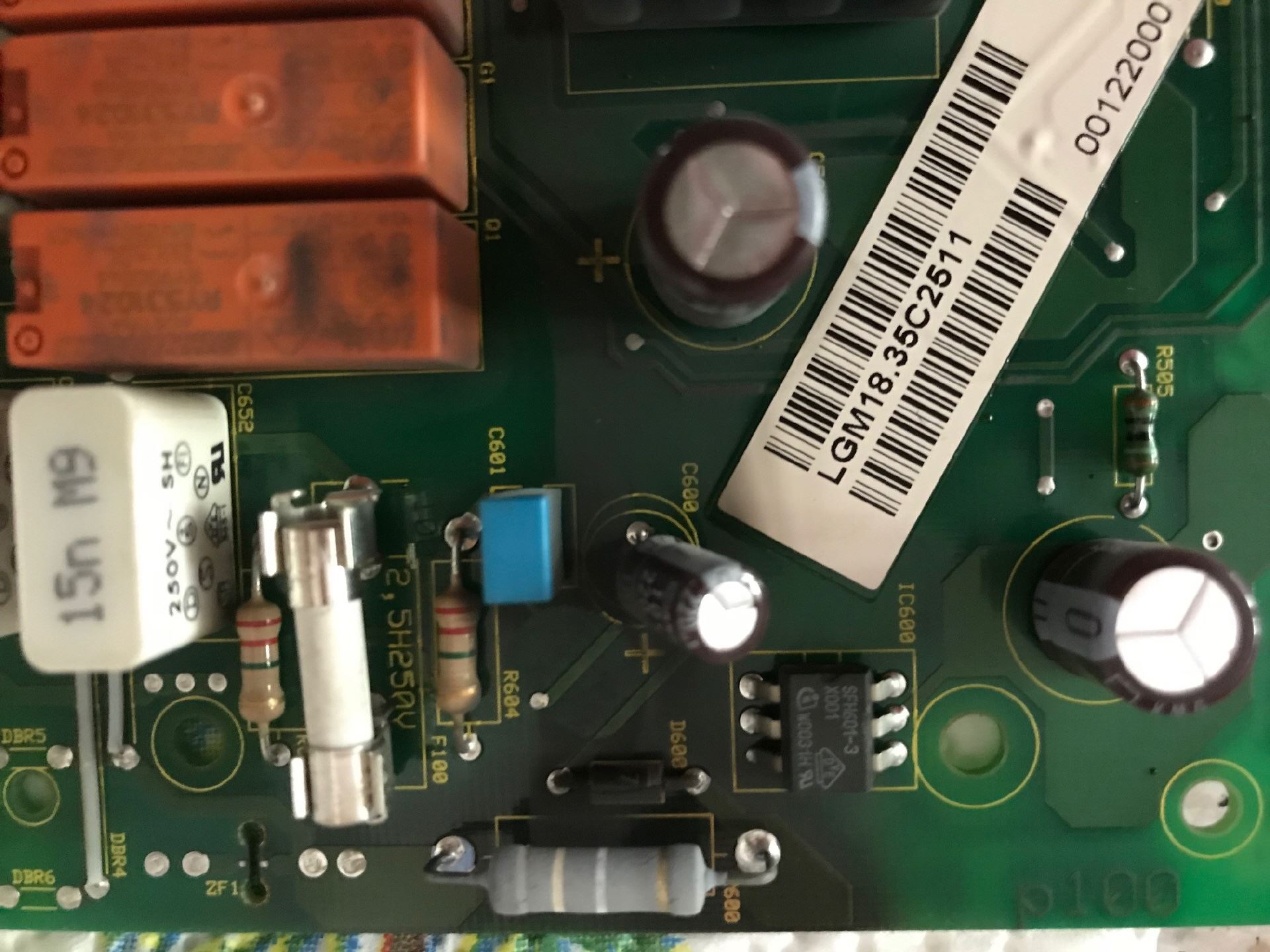 Dabei ist mir aufgefallen dass auf der Hauptplatine LGM18.35C2511 am Bauteil D 600 Russ sich entwickelt hat bzw. auch am Gehäuse braune Spuren sichtbar sind. (siehe Bild rechte Rand mitte, direkt links von dem grauen länglichen "Kondensator")